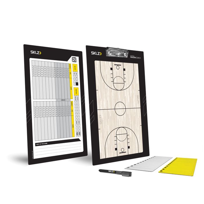 Use this double-sided magnetic, dry-erase board to align your team and track your stats. One side includes a full court for diagramming plays, while the other side allows you to set line ups using the 12 white and 12 yellow rectangular magnets, and allows you to track fouls, timeouts, and matchups.